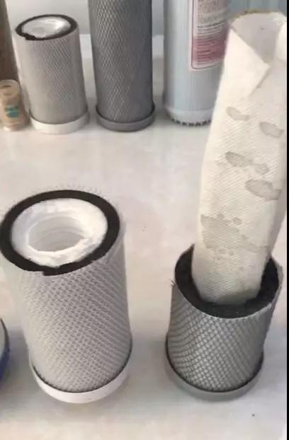 活性炭濾芯包裹的PP棉,左邊是厚實有料,右邊就一張薄紙一般的過濾棉