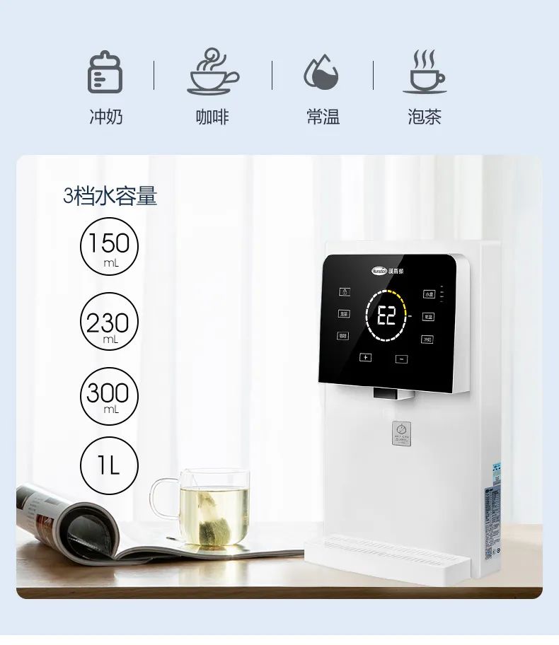 LED屏,一鍵觸控,定制水量調節+常溫+泡奶選擇,具有流量記憶,不用頻繁設置,自動記住你要的選擇,安全可靠;多檔水溫精準可調,秒速即熱,每一杯都是新鮮水,用不同的溫度匹配不同的飲品。