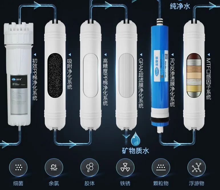 在眾多產(chǎn)品中,漢斯頓HSD-75G-07表現(xiàn)更為出眾,凈水器配有六級(jí)過濾,5微米PP棉濾芯、前置活性炭、1微米PP棉,專利技術(shù)GPAN超濾膜濾芯、RO 反滲透膜濾芯和專利MTF口感因子濾芯。