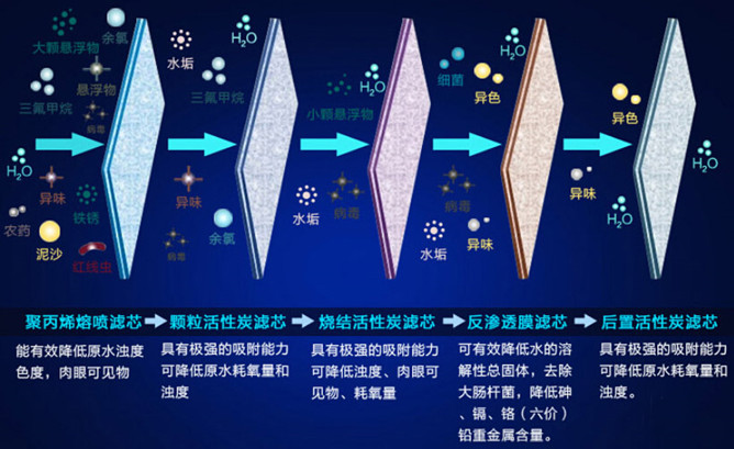 它采用的是反滲透膜技術,這項技術目前廣泛運用于醫學(如腎病血液透析)、航天(宇航員體液循環)、海水淡化等高新科技領域,近年運用此技術又開發出運用于民間的水凈化設備。它的工作原理是對水施加一定的壓力,使水分子和離子態的礦物質元素通過一層反滲透膜,而溶解在水中的絕大部分無機鹽(包括重金屬)、有機物以及細菌、病毒等無法透過反滲透膜,從而肩透過的純水和無法透過的濃縮水嚴格的分開;反滲透膜上的孔徑只有0.0001um,而病毒的直徑一般有0.02-0.4um,普通細菌的直徑有0.4-1um,所以你盡可以放心大膽的飲用純水機里流出的清泉。
