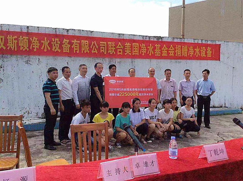 2016年6月7日,茂名市樹仔中學在校園內隆重舉行對漢斯頓捐贈全套凈水設備的感謝會。據了解,此次漢斯頓凈水設備聯合美國凈水基金會共捐贈價值22.5萬元的凈水器,不僅全面改善了樹仔中學全校師生的飲水情況,而且折射出了一家愛心企業對公益事業的熱愛和支持。