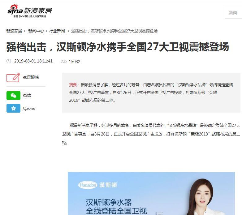 對漢斯頓品牌來講,2019年,注定是瘋狂的一年,是不平凡的一年,而8月更是意義非凡。「漢斯頓“榮耀2019」戰略布局的第二槍開啟了。8月26日起,漢斯頓凈水品牌廣告片在北京衛視、浙江衛視、廣東衛視、江蘇衛視、湖南衛視、江西衛視、東方衛視等27省王牌電視臺強勢播出,品牌魅力全面爆發,高頻次亮相,強勁品牌推廣,敬請期待!