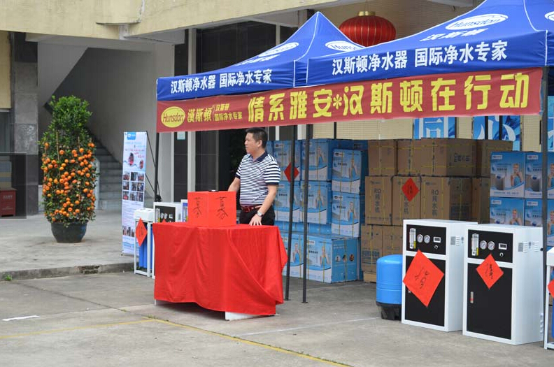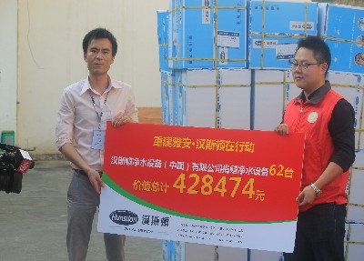 2013年4月,在四川省雅安市蘆山縣發生地震,漢斯頓作為深圳首批捐贈企業迅速做出反應,第一時間出去漢斯頓公益團隊30余人,帶上捐贈物質,設備及食品,前往災區一線,進行救援活動。對于災區首期重建工作,漢斯頓將捐贈價值100萬的凈水設備,來保障災區人民的飲水安全。