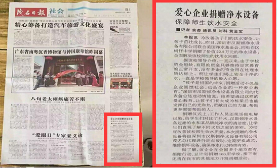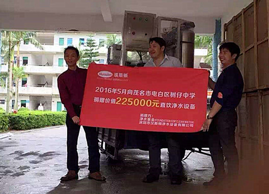 2016年6月,漢斯頓凈水器和美國基金會,聯合發起的“以愛凈水”公益項目,向茂名市電白區樹仔中學捐贈價格22.5萬元的全套凈水設備正式使用。該活動得到了政府、學校領導、學生的支持和贊揚,在當地引起不小的反響。