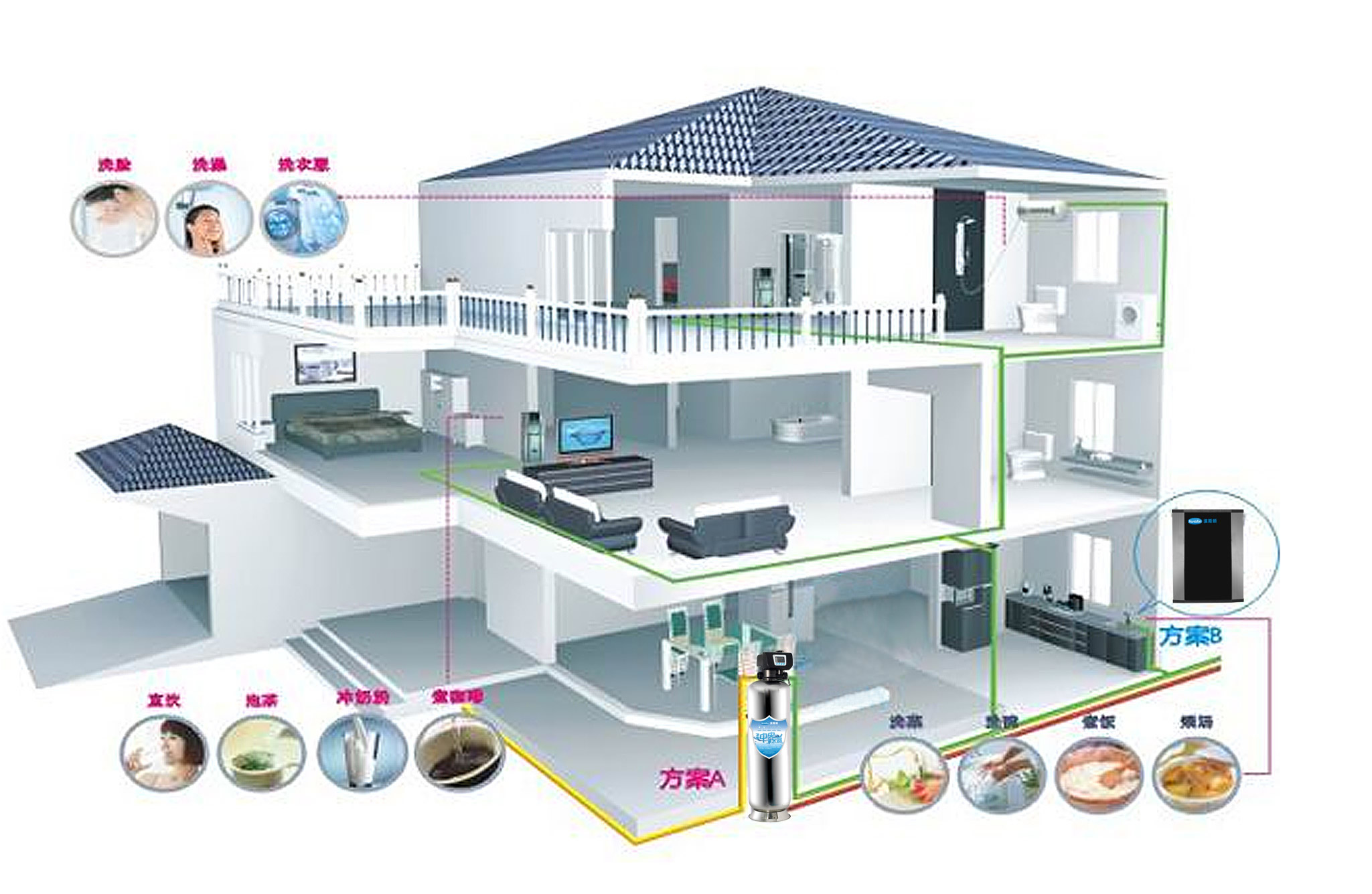 家庭全屋生活飲用水凈化,包括飲水、廚房用水、洗漱用水、沐浴用水、洗衣用水等的全面凈化。對于洗漱和沐浴用水來講,也需要深度凈化以防止細菌等有害物質通過皮膚進入人體,對于洗衣用水,要求水的濁度和硬度不能太高。因此,對家庭全屋生活飲用水進行全方位合理的凈化,可以采用中央凈化結合終端凈化的兩種凈水方式。在制水量方面,需要考慮能滿足多個凈水龍頭同時用水時的制水能力。