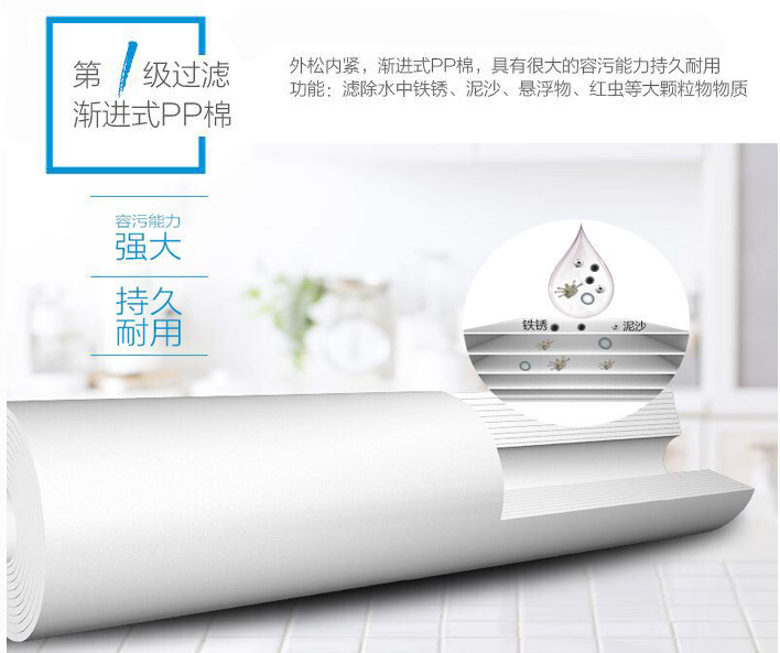 凈水器的工作原理多是通過各種濾芯(例如PP棉、活性炭、反滲透膜等),將水一層層凈化,達(dá)到去除雜質(zhì)的目的。自來水一次通過PP棉濾芯、顆粒活性炭濾芯、PP棉濾芯、反滲透濾芯和后置活性炭濾器,去除水中的泥沙、鐵銹、膠體、細(xì)菌、懸浮物等其他物質(zhì)。